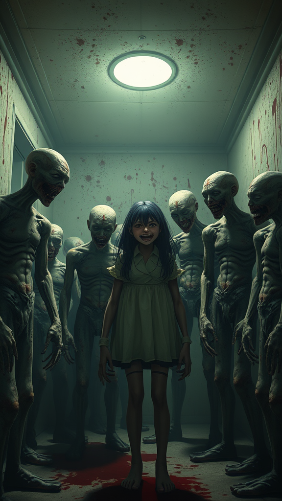 A hyperrealistic, ultra high-resolution 8k image capturing a chilling horror scene. In a dimly lit room, a group of deformed, grotesque figures with additional limbs and heads stands menacingly. Blood splatters adorn the walls, creating a macabre atmosphere. Among them, a yandere-like character with an unnerving evil laugh echoes, sending shivers down the spine. The visual is a raw photo with vivid details, blending hyper-realism with dark illustration, capturing the terror and unease of these malformed creatures. Their ugliness and crippling disfigurements are both shocking and captivating, drawing the viewer into a nightmarish world.