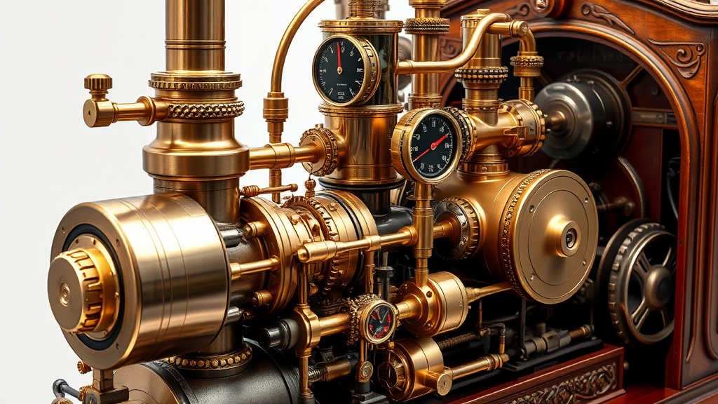 A intricately designed steam engine featuring an elaborate network of gleaming brass pipes and polished steel gears, with ruby-encrusted gauges and hand-engraved dials meticulously measuring pressure and temperature, housed within an artisanal wooden casing adorned with ornate carvings, all driven by a powerful steam turbine that hisses with rhythmic precision, evoking a sense of both antiquity and advanced engineering.