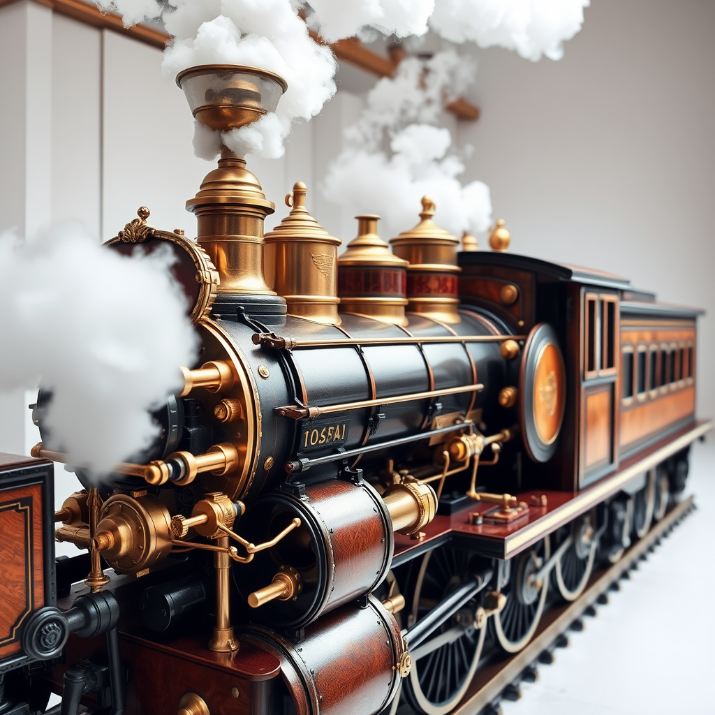 A intricately designed steam locomotive with elaborate brass fittings and polished oak paneling, featuring an array of interconnected pistons and gears in perpetual motion, exuding a rhythmic hissing sound as plumes of white steam billow from its chimney. The train's exterior is adorned with ornate carvings and intricate metalwork, capturing the essence of Victorian elegance while embodying a sense of constant innovation and mechanical wonder.
