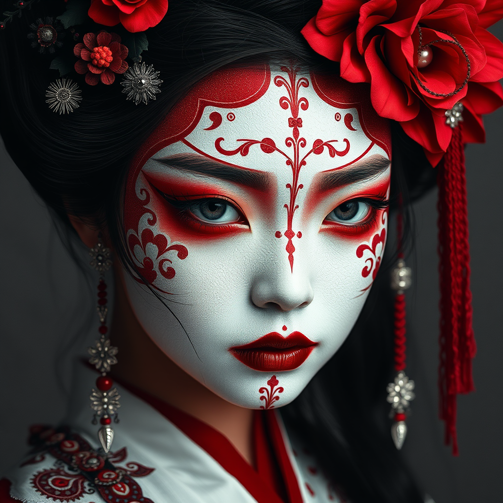 A Japanese girl with a red and white painted face, embodying gothic futurism, enveloped in monochromatic symmetry with intricate embellishments. The image is eerily realistic, drawing influence from Yup'ik art, utilizing photo-realistic techniques. Her visage resembles delicate porcelain, with subtle creative variations to enhance the core concept.