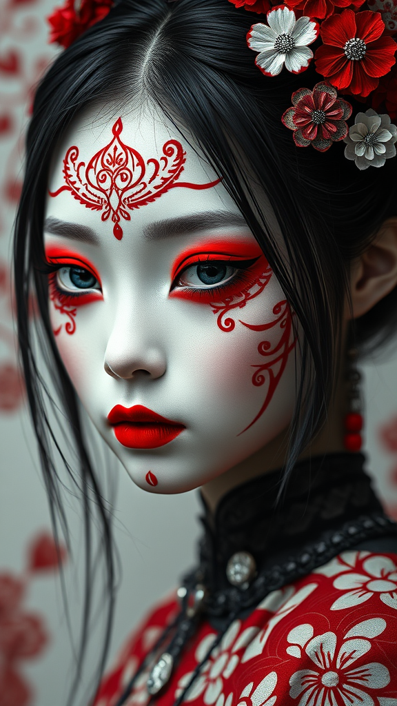 A Japanese girl with a red and white painted face in the style of gothic futurism, showcasing monochromatic symmetry with intricate embellishments. Her eerily realistic appearance draws inspiration from Yup'ik art, utilizing photo-realistic techniques to portray her porcelain-like skin. Her expression is hauntingly serene, framed by delicate patterns that blend traditional elements with a futuristic twist. The portrait captures an ethereal quality, where modernity meets ancient artistry, creating a visually striking and imaginative fusion.