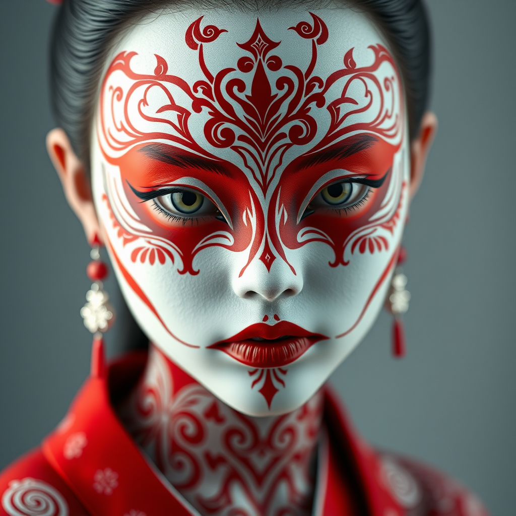 A Japanese girl with a red and white painted face, embodying gothic futurism, displaying a monochromatic symmetry with elaborate intricacies, eerily lifelike, inspired by Yup'ik art, crafted using photo-realistic techniques, with a porcelain finish.