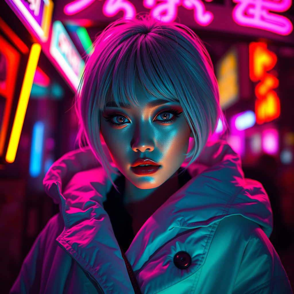A Japanese lady sporting striking white contact lenses and dramatic thick eyeshadow, enveloped in an oversized coat illuminated by black light, her hair a striking shade of white. Vibrant neon lights cast colorful reflections on her face, creating a captivating contrast in a hyperrealistic, photorealistic scene. Captured in ultra-high definition 8k using the latest in unreal engine technology, the shot is framed in an expressive 9:16 aspect ratio, evoking a sense of surreal elegance and modern mystique.