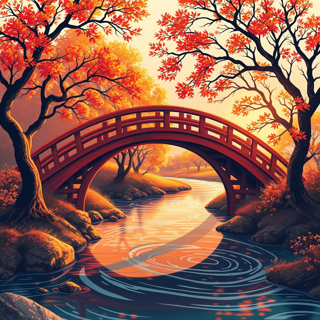 A Japanese traditional art style illustration depicting a timeworn red wooden bridge gracefully arching over a winding stream. The scene is bathed in the enchanting, golden hour light, which casts a warm, ethereal glow over the setting. Stylized trees with abstract, flowing branches surround the bridge, their leaves shimmering in shades of gold and crimson. The stream reflects the vibrant colors of the sunset, creating a harmonious blend of nostalgia and modern dynamism. Gentle ripples in the water mirror the bridge's structure, adding an element of fluidity. The composition evokes a sense of tranquility and timeless beauty, capturing the essence of nature and tradition intertwined seamlessly in a 16:9 aspect ratio.