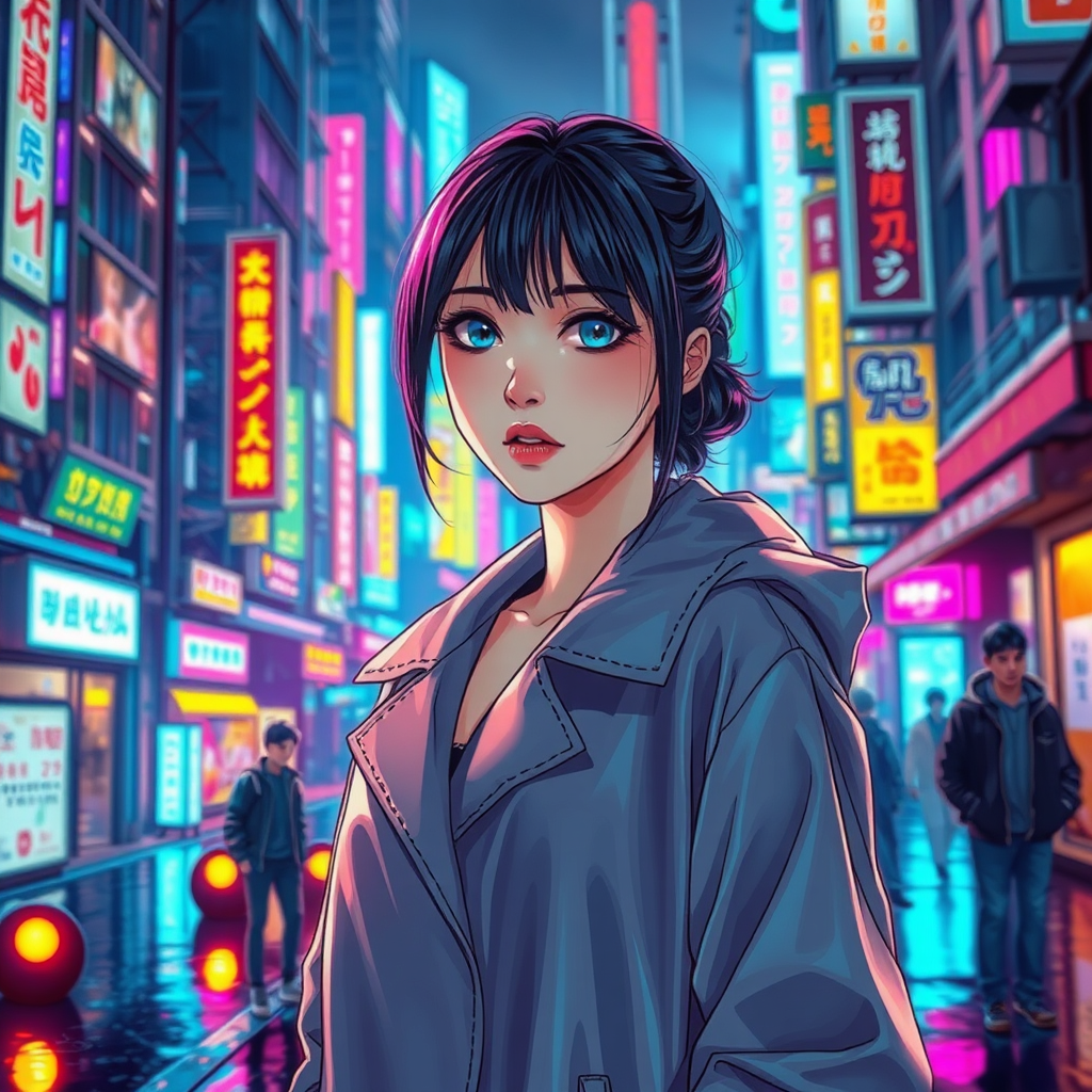 A Japanese woman in a sleek raincoat stands poised on a neon-lit city street, her symmetrical features capturing the essence of anime elegance. The bustling atmosphere of futuristic urban life envelops her, blending elements of anime cyberpunk art with vibrant colors reminiscent of Cyberpunk 2077. The scene is brought to life through detailed, full-color manga visual style, with key visual elements highlighting her presence amidst the dynamic skyline and glowing holograms. Her eyes, a striking shade of electric blue, reflect the city’s pulse, while the raincoat shimmers with iridescent hues, adding a touch of mystique to the cybernetic ambiance.