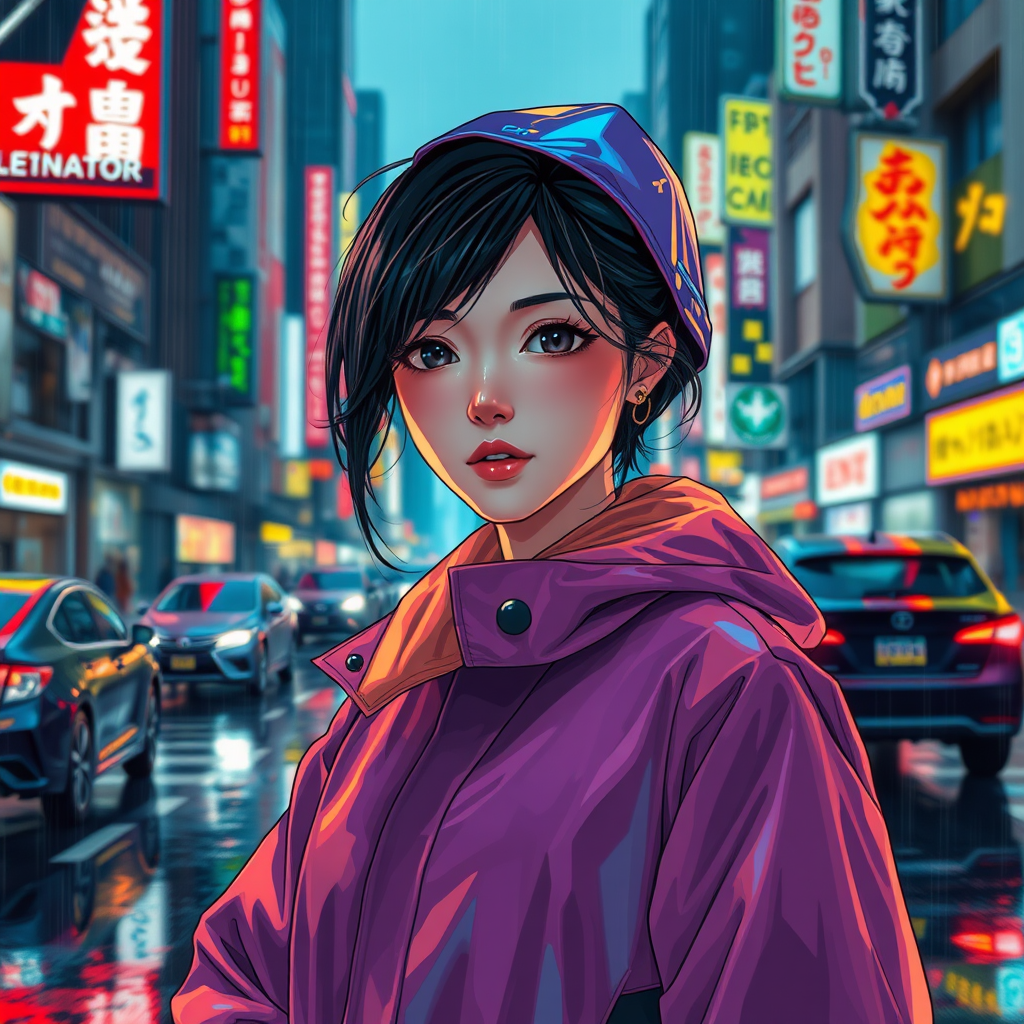 A Japanese woman in a vibrant, futuristic raincoat stands on a bustling city street, her face adorned with detailed, symmetric features reflecting the precision of anime-style art. Neon lights gleam off rain-slicked surfaces, capturing the essence of cyberpunk and reminiscent of Cyberpunk 2077's aesthetic. The scene bursts with full color in a manga visual style, blending anime key visuals with the unique flair of InkPunk768, as the urban landscape hums with sleek hover cars and towering holographic billboards. She gazes confidently, embodying the fusion of tradition and technology, her presence a striking balance between serenity and the throbbing pulse of a cybernetic metropolis.