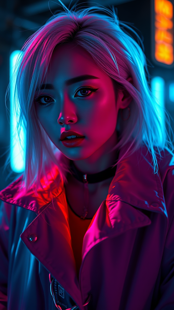 A Japanese woman with striking white contact lenses and bold, expressive eyeshadow, dressed in an oversized coat illuminated by black light, her hair a striking white. Neon light reflections dance across her features, captured in hyperrealistic, photorealistic detail at 8k resolution using Unreal Engine. The atmosphere is vibrant and dynamic, with an expressive style and a touch of surreal elegance. The scene emphasizes the contrast of colors and textures, generating an immersive visual experience.