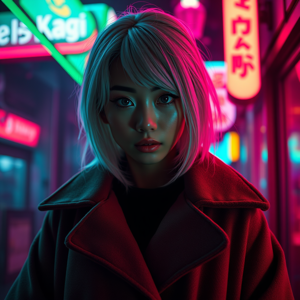 A Japanese woman with striking white contact lenses and bold, thick eyeshadow. She is adorned in an oversized coat, standing under the enigmatic glow of black light. Her hair is a vibrant white, catching the vivid neon lights reflecting around her. The scene captures a sense of hyperrealism and photorealism, as if crafted in an 8k resolution using the Unreal Engine. The atmosphere is expressive, with dynamic neon hues playing over her features, adding depth and intrigue to the visual experience, set in an artistic ratio of 9:16.