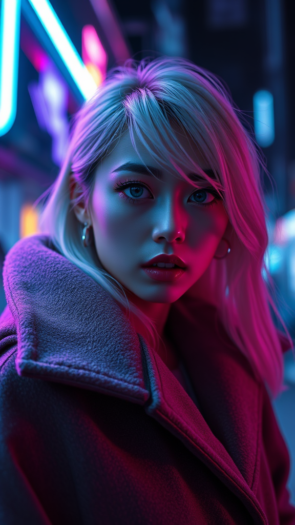 A Japanese woman with striking white contact lenses and bold, thick eyeshadow, draped in an oversized coat under a black light. Her hair is a striking white, catching the vibrant reflections of neon lights. Captured in hyperrealism, the image is photorealistic with incredible detail, reminiscent of 8k quality and crafted using unreal engine. The composition is framed in an expressive and artistic style, with the aspect ratio of 9:16 providing a dynamic and immersive experience, embracing a subtle yet powerful ambiance.