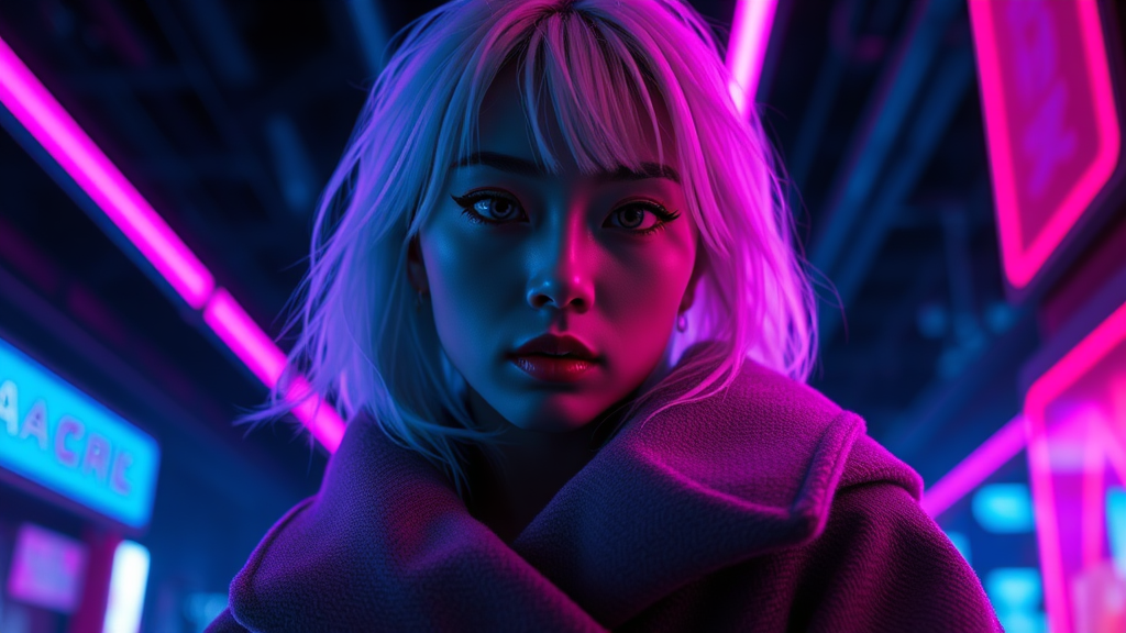 A Japanese woman with striking white contact lenses and bold, thick eyeshadow stands out in a dramatic scene. She's enveloped in an oversized coat under the glow of black lights, her white hair catching the neon light reflections around her. The setting is hyperrealistic and photorealistic, captured in 8K resolution with unreal engine craftsmanship. The ambiance is vibrant, with a touch of expressionism, as the bright neon hues contrast with the dark backdrop, creating a surreal and captivating atmosphere. Subtle variations in the lighting and shadows enhance the mystery and allure of the scene.
