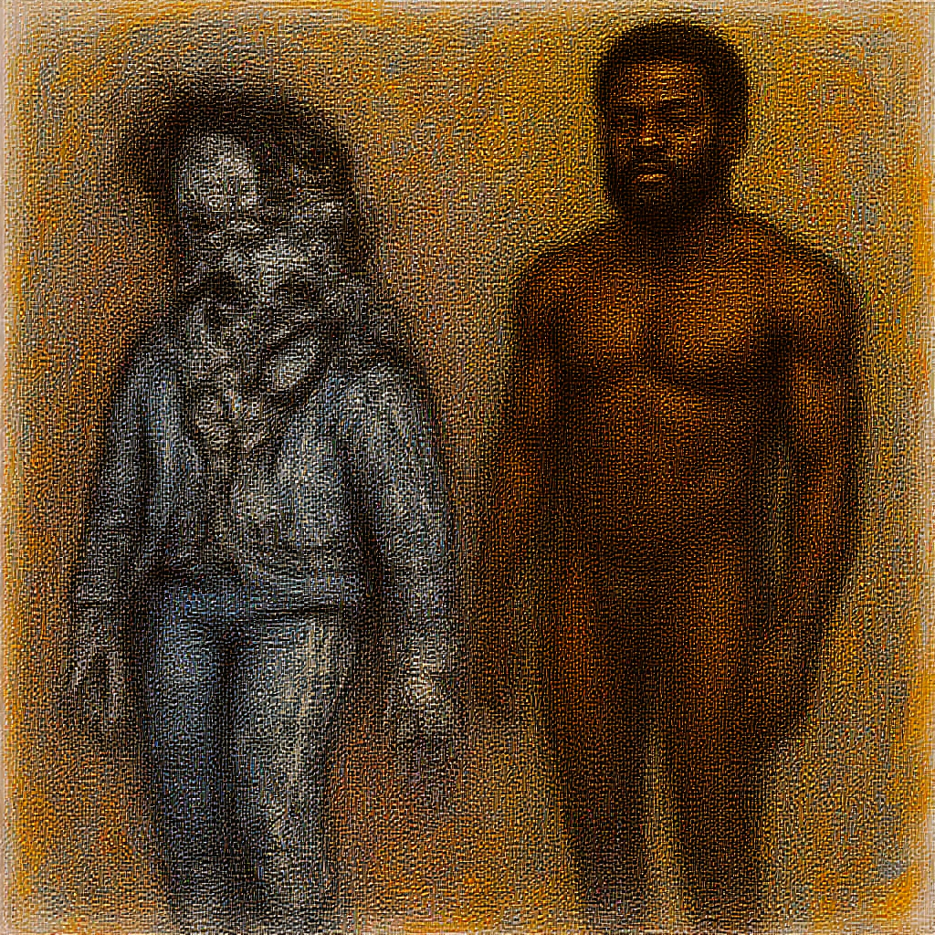 A Jean Michel Basquiat-inspired depiction of a cyborg girl donning an Adidas tracksuit, exuding an air of sporty opulence reminiscent of the 80s. The scene blends elements of vintage photography with an abstract touch, juxtaposed with the raw artistry of a naked black man, echoing the style of Manet. This sketch melds cartoonish flair with an avant-garde twist, exploring a unique fusion of form and worst quality aesthetics.