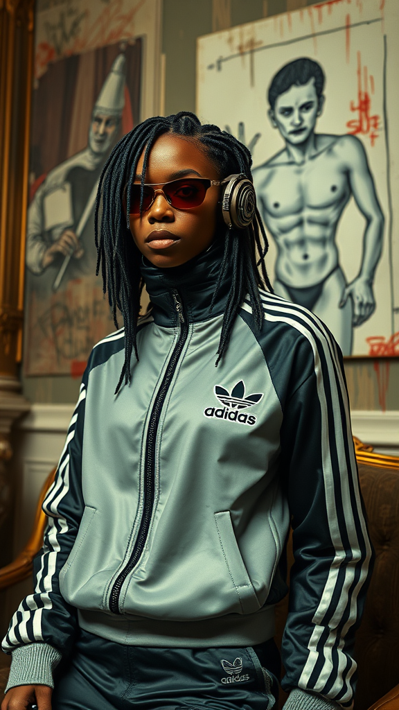 A Jean Michel Basquiat-inspired scene featuring a cyborg girl in an Adidas tracksuit, blending sporty and opulent aesthetics with retro 80s flair. The setting is reminiscent of vintage photography, juxtaposing a classic elegance with an abstract twist. In the background, a nod to Manet with a boldly sketched, cartoon-like depiction of a nude Black man adds an eccentric edge. The overall composition combines graffiti-like elements with a rough, unfinished quality that evokes the raw energy of Basquiat's art.