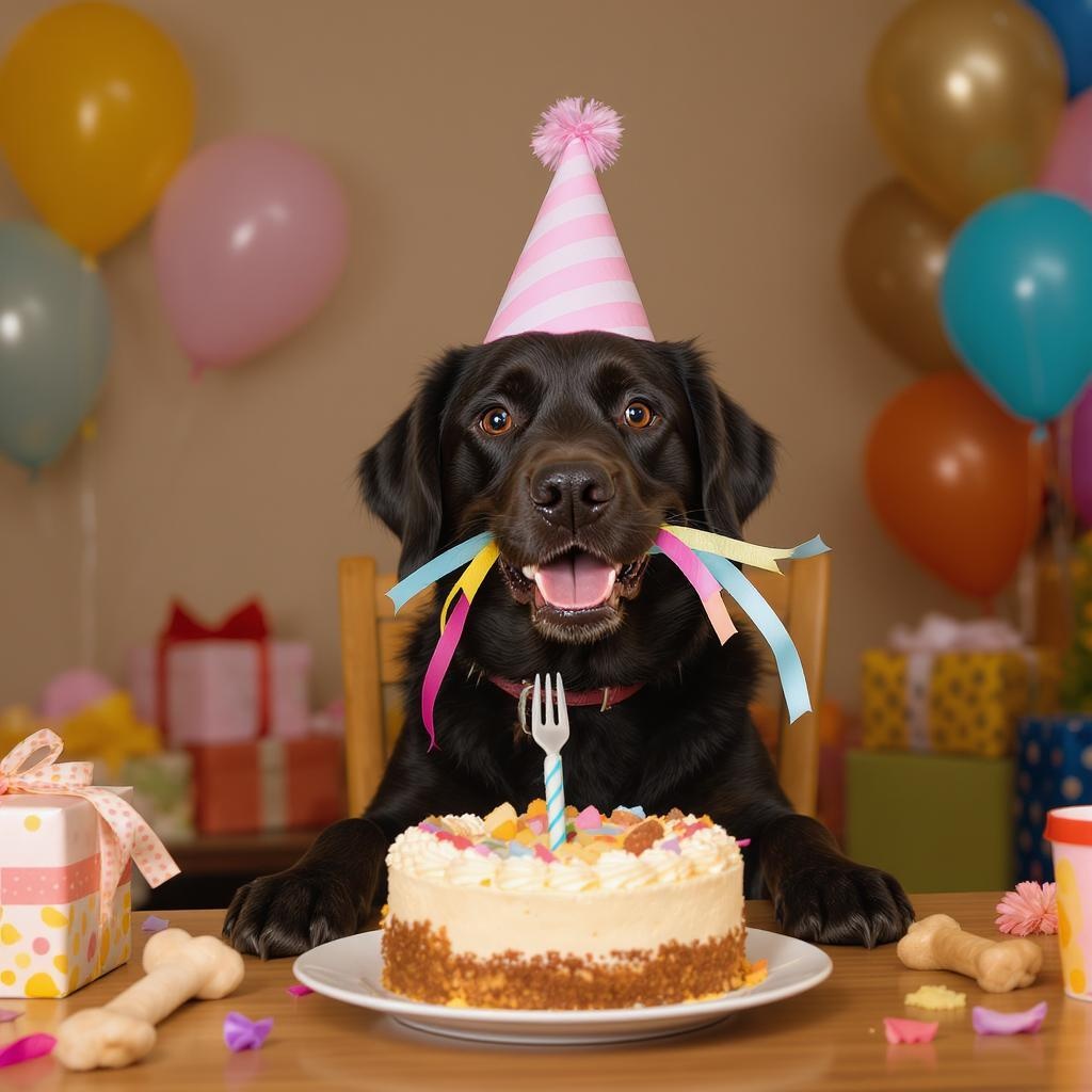 A joyful, adorable dog with shiny fur sits eagerly at a table, wearing a charming pastel party hat tilted slightly on its head, a playful ribbon hanging down. In its mouth it holds a colorful paper streamer instead of a plastic fork. Before the dog lies a scrumptious cake adorned with playful dog-friendly decorations, surrounded by a delightful assortment of treats arranged with care. Vibrant balloons and wrapped presents fill the room, creating an atmosphere bursting with joy and celebration. The cozy space is bathed in soft studio lighting, enhancing the warm, vivid colors and meticulous details of the scene. The composition follows the Rule of Thirds with a whimsical odd object, perhaps a small toy bone beside the cake, adding an unexpected touch. The setting captures the essence of a perfect moment filled with love and joy, a memory cherished in time.