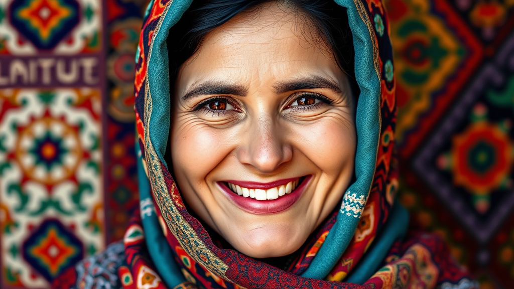 A joyful Afghan woman wearing a colorful hijab, her eyes sparkling with warmth and a genuine smile, surrounded by a vibrant tapestry of cultural patterns reflecting her rich heritage.