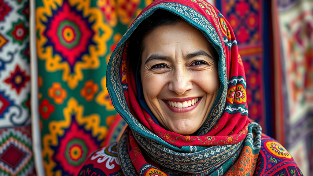 A joyful Afghan woman wearing a colorful hijab, her eyes sparkling with warmth and joy as she stands against a backdrop of vibrant local patterns.