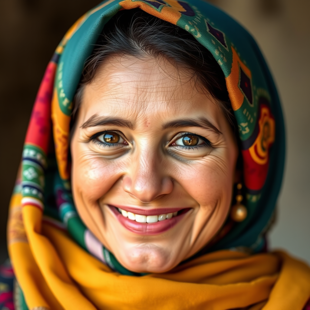 A joyful Afghan woman wearing a colorful hijab, her eyes sparkling with warmth and a genuine smile that radiates kindness and resilience.