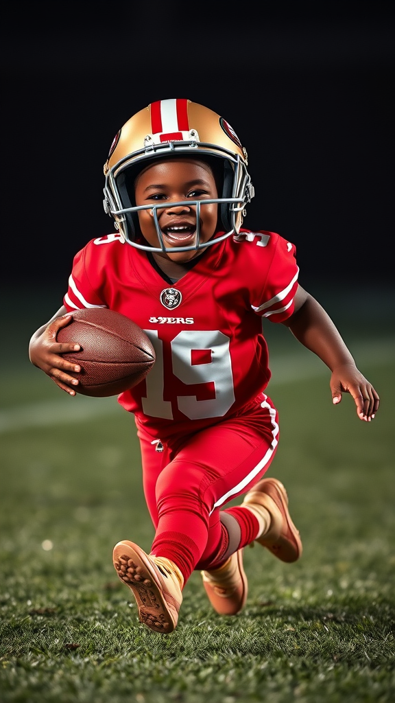 A joyful African American toddler, dressed in a vibrant red and gold San Francisco 49ers uniform complete with a helmet, is captured mid-action as he energetically runs with a football, beaming with happiness while scoring a touchdown. His small feet kick up turf as he celebrates an exhilarating victory, his face alight with pure joy. The scene is bathed in dramatic lighting, emphasizing his dynamic pose and highlighting the hyper-realistic details of the moment. Shot with professional precision on a Canon EOS-1D X Mark III, this image captures the essence of youthful exuberance and passion for the game.