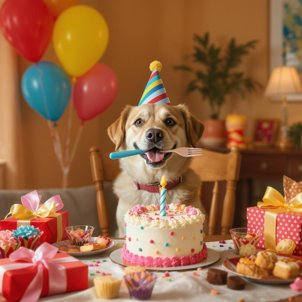A joyful and adorable dog sits eagerly at a festive table, wearing a charming party hat and holding a colorful plastic fork gently in its mouth. The table is adorned with a beautifully decorated cake and an array of delightful treats, while vibrant balloons and elegantly wrapped gifts fill the room, enhancing the celebratory ambiance. The cozy space is bathed in soft studio lighting, highlighting the exquisite details and warm, inviting colors throughout. The composition follows the rule of thirds, creating a pleasing balance, with a playful odd object subtly integrated into the scene to add intrigue and charm.