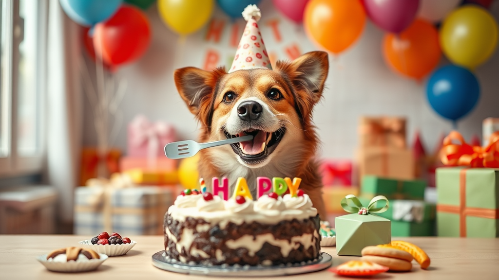 A joyful and adorable dog with a charming party hat perched on its head and a playful plastic fork between its teeth is seated at a festive table. In front of the dog, there's a beautifully decorated cake surrounded by a variety of delightful treats. The room is filled with colorful balloons and thoughtfully wrapped gifts, creating an inviting and celebratory ambiance. The scene is illuminated by soft studio lighting that enhances the warm and vibrant colors, and every detail is rendered with exquisite precision. The composition thoughtfully adheres to the Rule of Thirds and incorporates an intriguing odd object for added interest.