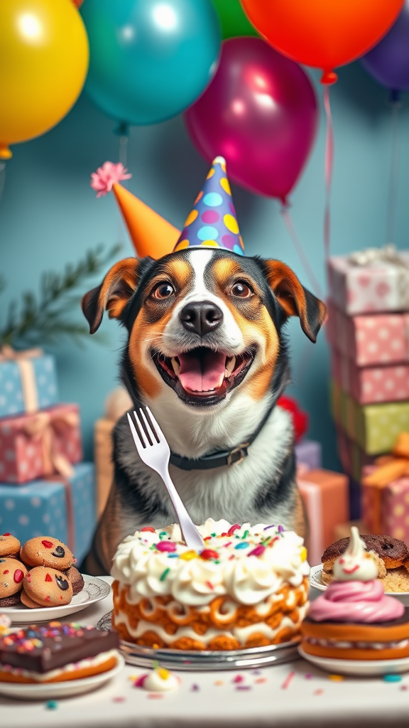 A joyful and adorable dog with a colorful party hat perched on its head and a playful smile, holding a plastic fork gently between its teeth. The dog is seated at a festively decorated table, surrounded by a scrumptious cake and an array of delicious treats. Bright balloons float above and thoughtfully wrapped gifts are piled high around the room, enhancing the cheerful and cozy atmosphere. The scene is brightly lit with studio lighting, revealing the lush textures and vibrant hues. The composition follows the rule of thirds with an unexpected odd object subtly placed, adding a touch of whimsy.