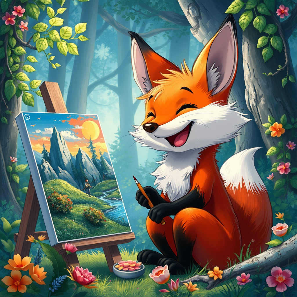 A joyful and animated fox engrossed in crafting a vivid landscape painting, the scene bursting with an array of vibrant colors and intricate details. The artwork captures the enchanting style of Studio Ghibli, with influences from Bastien Lecouffe-Deharme, set against a whimsical forest backdrop. This fantasy illustration showcases the fox's delightful expression and creative spirit, surrounded by an array of lush greenery and fantastical elements, evoking a sense of wonder and magic.