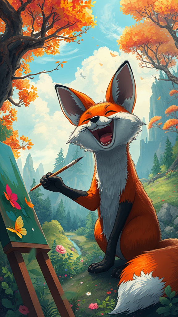 A joyful and animated fox joyfully paints a breathtaking landscape filled with vivid colors and intricate details. The scene is reminiscent of a Studio Ghibli animation, blended with the fantastical artistry of Bastien Lecouffe-Deharme. A whimsical, enchanted forest serves as a captivating backdrop, teeming with life and magical energy. The fox's brushstrokes bring to life a scene of wonder and imagination, where the raw beauty of nature is lovingly captured in its essence.