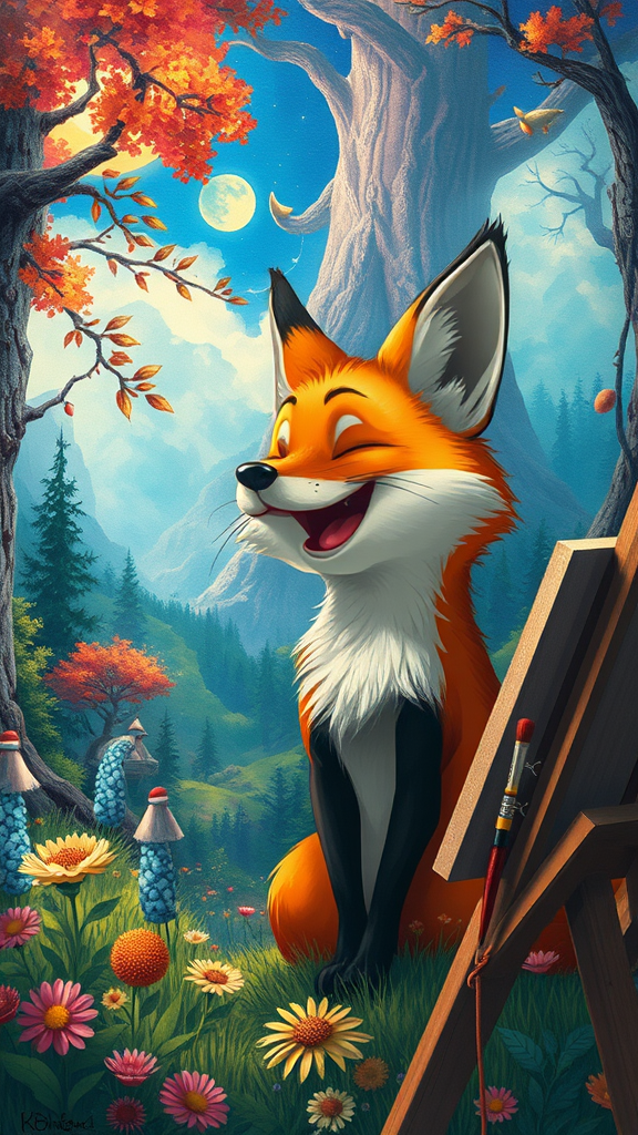 A joyful and animated fox joyfully paints a stunning landscape, filled with lively and vibrant colors and rich, intricate details. The scene is inspired by Studio Ghibli and Bastien Lecouffe-Deharme, featuring a magical and fantastical illustration set in a whimsical forest backdrop. The fox's expression is of pure delight, surrounded by a canvas that captures the essence of an enchanting, mythical woodland, where every brushstroke brings the forest to life with a sense of wonder and imagination.