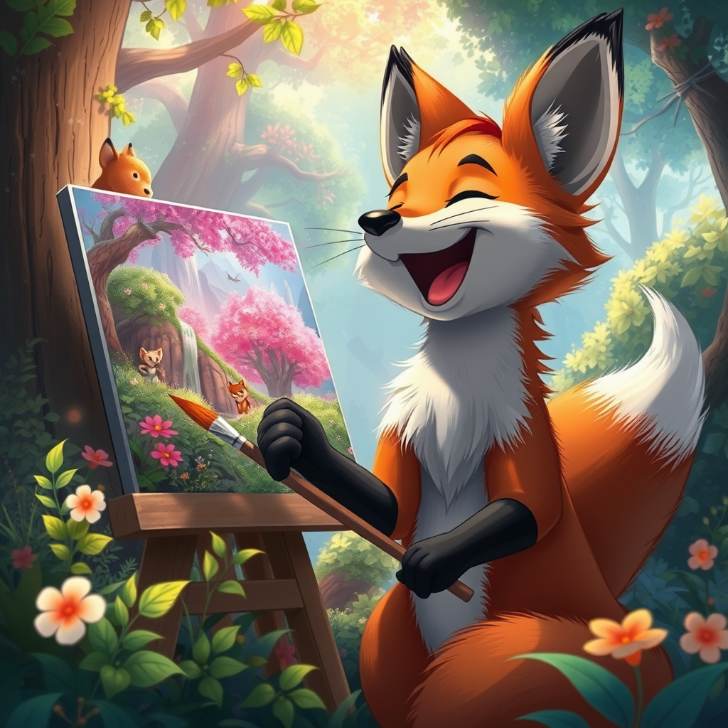A joyful and animated fox joyfully paints a stunning landscape, infused with lively colors and delicate details, inspired by Studio Ghibli and Bastien Lecouffe-Deharme, set against a magical forest backdrop. The scene captures a fairy-tale allure as the fox's brush brings life to a vibrant fantasy illustration, with whimsical woodland creatures peeking from behind lush foliage. The composition exudes an enchanting charm, enveloping viewers in a world where creativity and nature harmoniously intertwine.