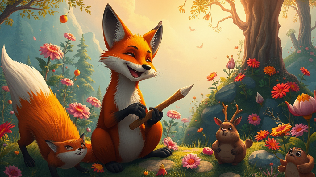 A joyful and animated fox, passionately crafting a stunning landscape with vivid hues and elaborate details, inspired by the enchanting artistry of Studio Ghibli and the imaginative style of Bastien Lecouffe-Deharme. The scene is set in a magical forest with whimsical backgrounds, featuring an array of vibrant flora and fauna, where the fox’s creativity shines amidst fantastical elements.