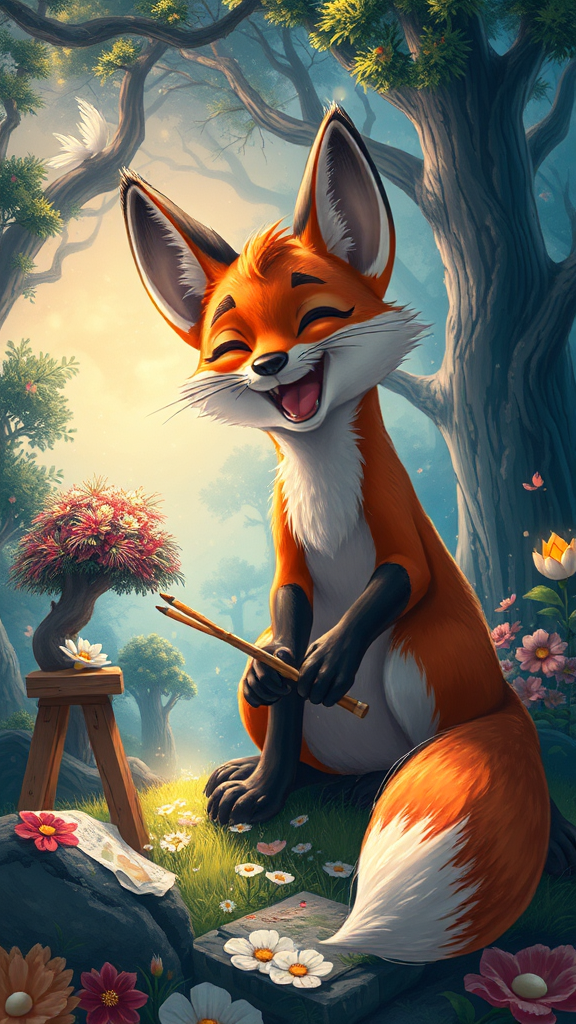A joyful and energetic fox immersed in creating a captivating landscape, bursting with vivid colors and elaborate details, inspired by Studio Ghibli and Bastien Lecouffe-Deharme. This fantasy illustration features a whimsical forest as the backdrop, teeming with magical creatures and ethereal light that dances through the trees. The scene captures the essence of nature's wonder and imagination.