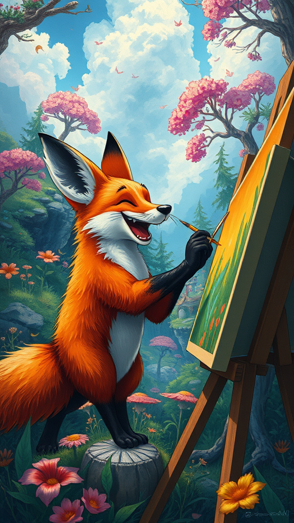 A joyful and lively fox, joyfully painting a breathtaking landscape filled with vivid colors and intricate details, in the style of Studio Ghibli and Bastien Lecouffe-Deharme. The scene captures a fantasy illustration with a magical forest backdrop, where whimsical trees and enchanting flora add a sense of wonder and enchantment. The fox's excitement is palpable as it brings the vibrant world around it to life on canvas, maintaining the essence of a raw and imaginative art style.