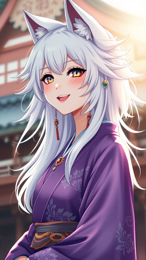 A joyful and stunning white-haired anime wolf girl dressed in a purple kimono, featuring flowing tresses, an elegant anime-style face, and soft, ambient lighting. The portrait captures a gentle blur with lens flare effects, showcasing her graceful stance. Her face is intricately detailed, as is her kimono, adorned with ornate accessories. She stands against the backdrop of a meticulously detailed Japanese building. The image is hyper-detailed, a true masterpiece in 4k, 8k resolution, capturing the essence of what is trending on art platforms.