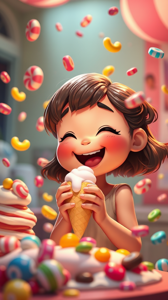 A joyful, enchanting scene featuring a cute, cheerful girl delighting in her ice cream, surrounded by colorful candies swirling around her in mid-air, reminiscent of Pixar and Disney animation style. The setting is illuminated with a warm, magical cinema-like glow, capturing the essence of whimsical gaming graphics in stunning 8k resolution. The atmosphere is imbued with a sense of wonder and love, creating an irresistible moment of pure joy and fantasy.