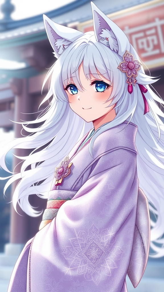 A joyful, enchanting white-haired anime wolf girl adorned in a shimmering lavender kimono, her flowing wavy hair cascading gracefully around a mesmerizing and expressive face. Captured in a delicate portrait under gentle, ethereal lighting, enhanced by subtle blur and mystical lens flare, the scene unveils intricately detailed accessories that complement her elegant attire. She strikes a graceful pose against the backdrop of an exquisitely detailed Japanese structure, each element meticulously rendered to perfection. This hyperdetailed image stands as a masterpiece, worthy of being spotlighted in 4k and 8k resolutions, and is beloved on platforms like Pixiv.