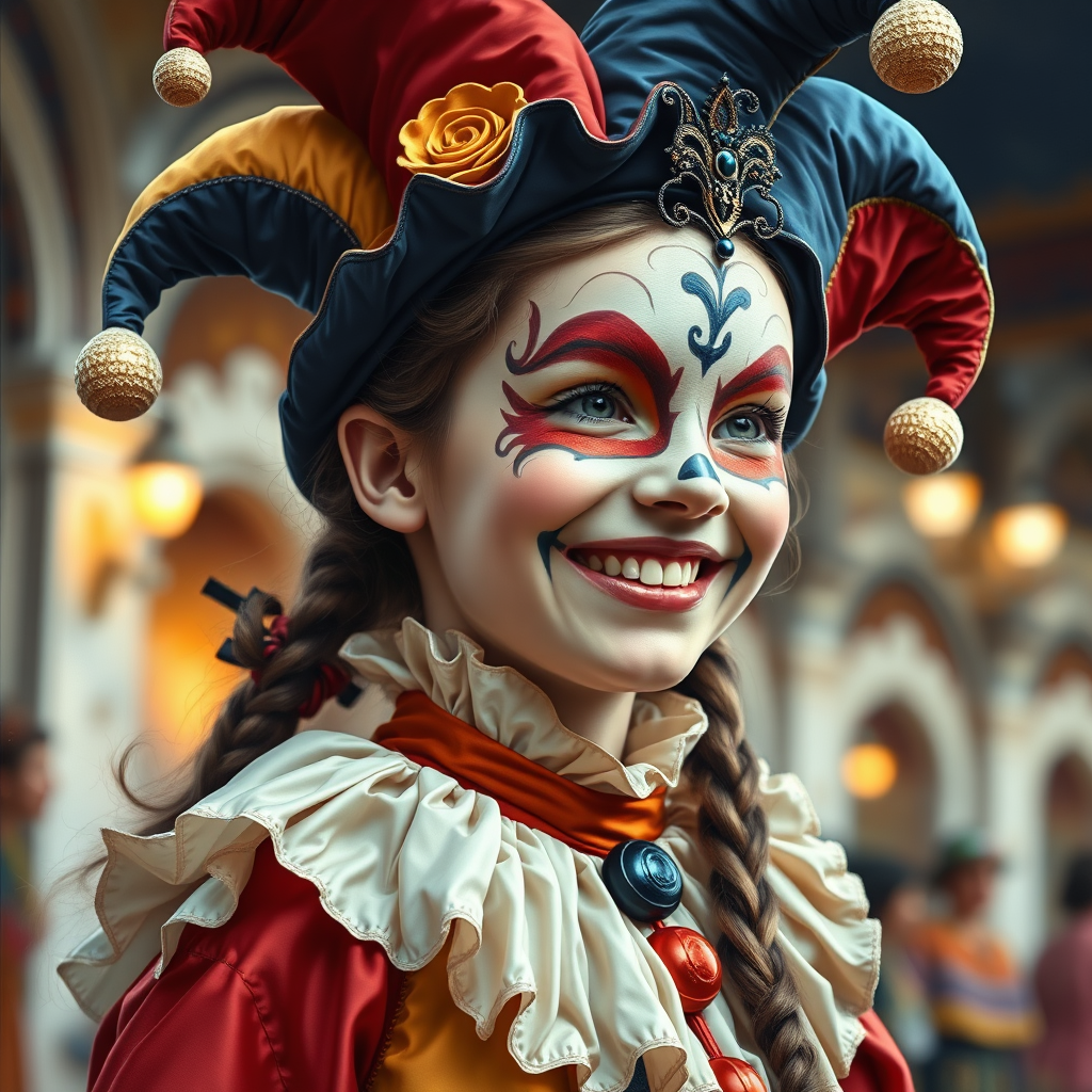 A joyful girl dressed as a harlequin at the Venetian carnival, beaming with delight, her playful and cute demeanor captured in a high-resolution, hyper-realistic oil painting. Her colorful costume and intricate mask are reminiscent of Venetian traditions, evoking the grandeur and mystery of the event. The full-body portrait, inspired by the style of Frank Frazetta, combines vivid detail and dynamic composition, showcasing the girl's smiling expression and lively presence in exquisite, lifelike clarity.