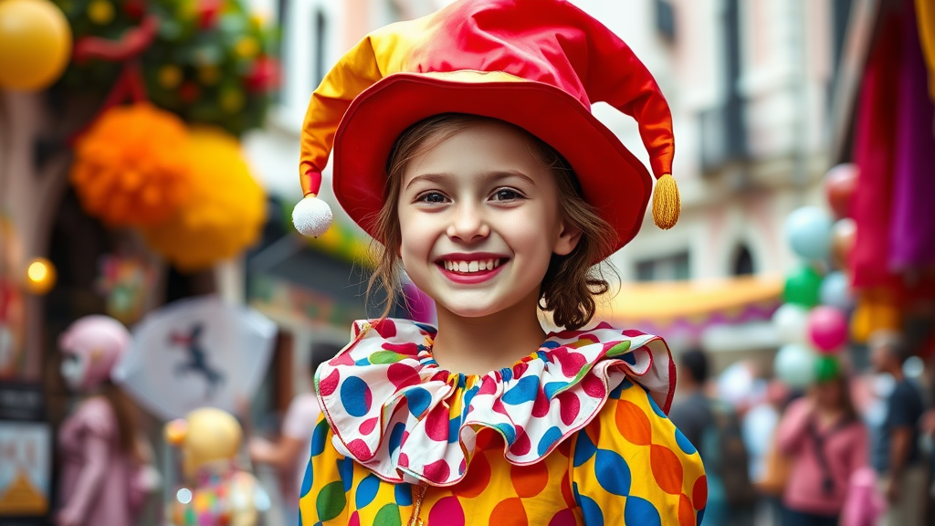 A joyful girl dressed in a colorful harlequin costume, smiling brightly amidst the vibrant atmosphere of a Venetian carnival; her outfit adorned with intricate patterns and vibrant hues, reminiscent of a beautiful painting by Daniel F Gerhartz, capturing the essence of youthful exuberance; her expression exudes innocence and delight as she embodies the playfulness of a clown, depicted in high resolution and hyper-realistic detail, her full figure gracefully framed against the lively backdrop of celebration.