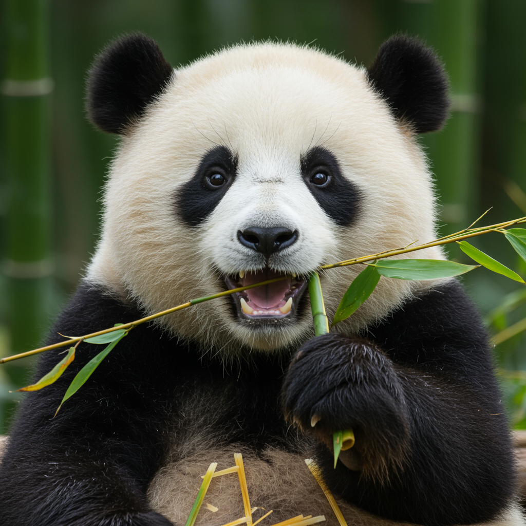 A joyful panda cub delightedly munching on bamboo, displaying a broad smile, vividly hyper-realistic, 8k resolution, a true work of art reflecting pure happiness.