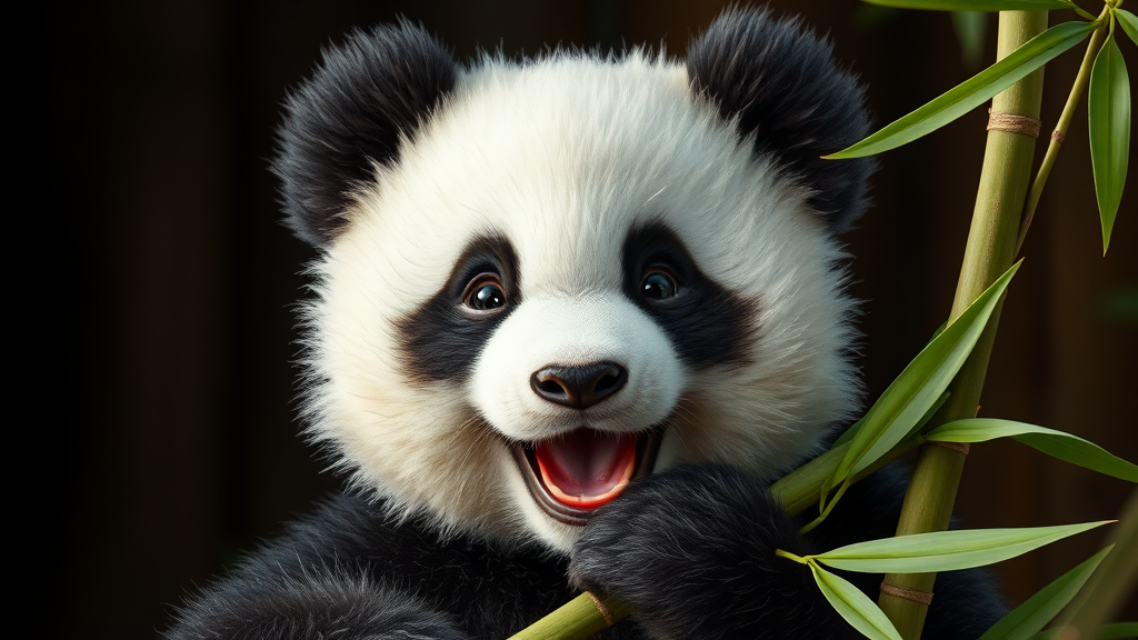 A joyful panda cub delightfully munching on bamboo with a heartwarming smile, rendered in hyper-realistic detail, 8k resolution, stunning visual masterpiece.