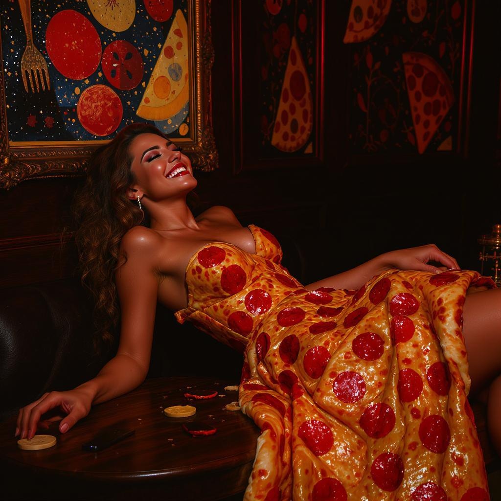A joyful woman adorned in a dress crafted from pizza reclines gracefully on a table, surrounded by rich, deep colors and intricate artwork. The scene is a vibrant masterpiece characterized by ultra-high quality, cinematic flair, and sharp focus, reminiscent of the epic visual style of Blade Runner. Her eyes exude warmth and clarity, enhancing the overall composition. The 4k resolution image is devoid of any blemishes such as text logos, watermarks, or any signs of low quality. The woman's anatomy is accurate and beautifully proportioned, with no extraneous or distorted features. Her body is positioned naturally and comfortably, with no signs of awkwardness or implausibility. The composition is centered and harmonious, and her expression is one of serene contentment, perfectly captured in crisp detail.