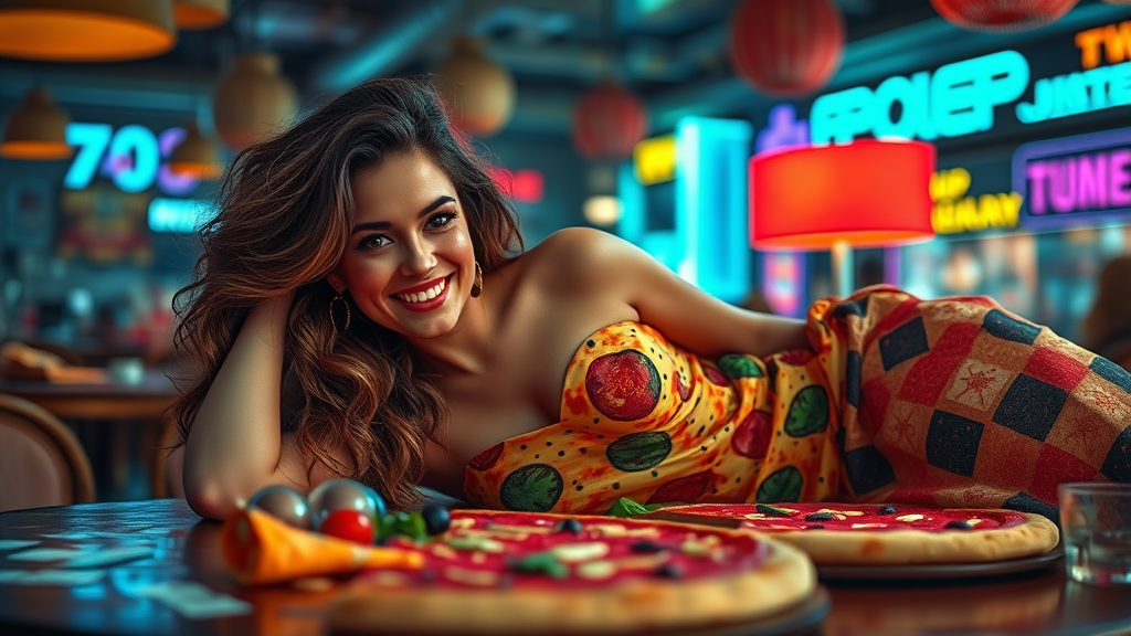 A joyful woman adorned in a pizza-inspired dress lounges gracefully on a table, surrounded by an array of rich, deep colors. The scene is a vibrant masterpiece of intricate artwork with cinematic quality and epic sharpness, rendered in ultra high 4k resolution. Her eyes are captivating, enhancing the vivid, high-quality portrayal, set against a beautifully composed backdrop that draws inspiration from a futuristic, Blade Runner-esque world.