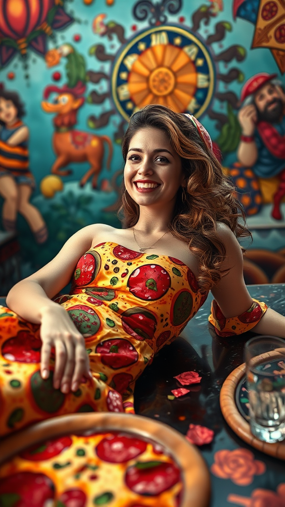 A joyful woman adorned in a pizza-themed dress reclines gracefully on a table, surrounded by vibrant and intricate artwork. The scene is a brilliant masterpiece, filled with rich, deep colors and cinematic flair. Her eyes are captivating and expressive, captured with an ultra-high-definition model, providing an epic, sharp focus in a stunning 4k resolution. Avoid any distracting imagery such as text logos, watermarks, or signatures, and ensure the composition is centered and seamless, maintaining accurate anatomy and natural body positioning. The focus remains on clarity and cohesion, avoiding any defects or distortions.