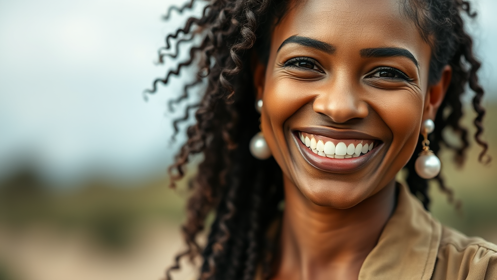 A joyful woman adorned with a shimmering pearl earring, her expression bright and inviting. Clad in hues of tranquil blue and earthy khaki, she embodies a meticulous and harmonious blend of elegance and sustainability. Her essence captures the spirit of solarpunk, where innovation meets nature, and li-core, radiating a vibrant synergy between humanity and a greener future.
