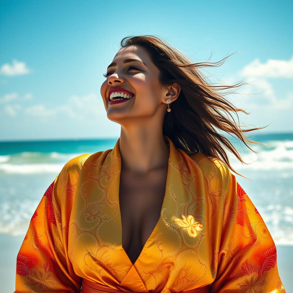 A joyful woman beams brightly while adorned in a lustrous golden kimono, glistening under the Miami sun on the beach. The intricate details of her attire shimmer vibrantly, capturing the essence of the scene in stunning realism. The expansive blue sky and gentle waves enhance the vivid imagery, creating a serene yet dynamic atmosphere that reflects in her expression. This vivid portrayal stands out with its bold use of light and texture, offering an immersive visual experience.