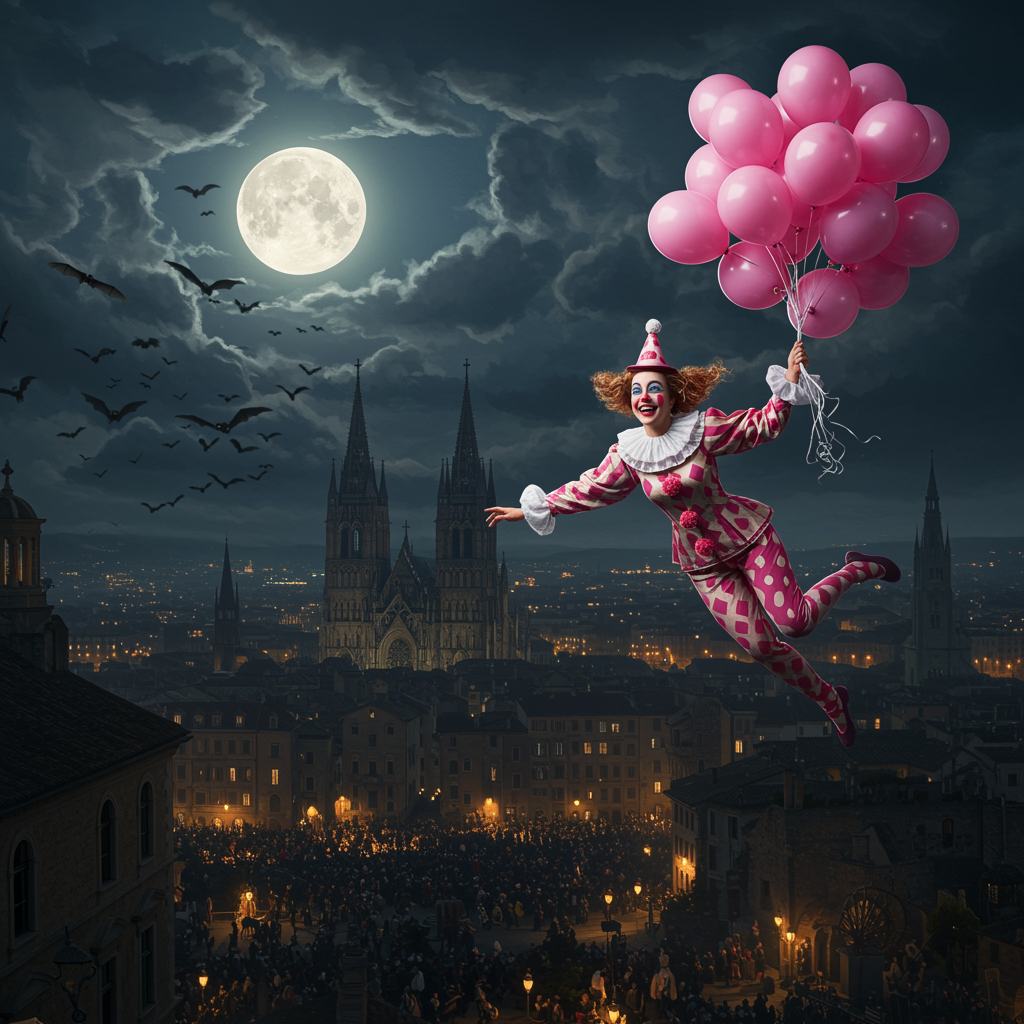 A joyful woman dressed as a flying clown is depicted in a hyper-realistic oil painting inspired by Albert Bierstadt. She exudes a kind smile and generous spirit as she floats above a crowded cityscape. The scene is set under an ominous midnight sky dominated by a full moon, with a partially clouded sky casting intricate shadows. Bats fly in the background, adding an element of mystery. She is holding a bunch of pink balloons, and her outfit includes vibrant polka-dot leggings. A majestic cathedral towers in the distance, partially shrouded in volumetric fog that diffuses the city lights below.