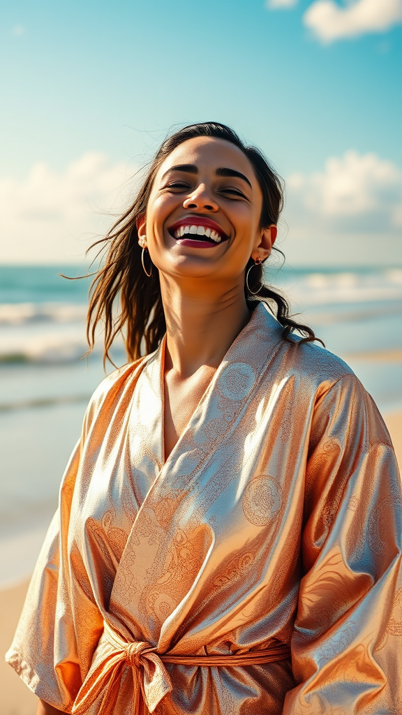 A joyful woman is basking in the Miami sunlight, adorned in a radiant, glossy silver kimono, her smile reflecting the warmth of the day. The scene captures a photorealistic and intricately detailed image, with a breathtaking 32K UHD quality. The vibrant beach background adds to the allure, with the gentle waves shimmering in harmony with her attire. The atmosphere is vivid and lifelike, with a touch of raw elegance, creating an exquisite visual narrative.