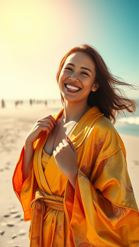 A joyful woman smiles brightly as she dons a radiant, glossy golden kimono, reflecting the warm sunlight on Miami Beach. The scene is vividly detailed and photorealistic, capturing intricate textures and the shimmering play of light on the fabric. The expansive beach in the background highlights the vibrant blue sky and gentle waves, creating a stunning 32K UHD image full of movement and life. The overall style is raw and fresh, emphasizing the natural beauty of the scene and the woman's serene expression amidst the lively beach atmosphere.