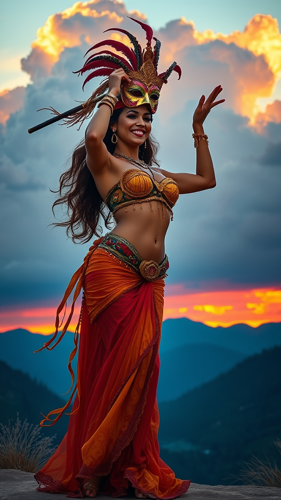 A joyful woman stands confidently, embodying the spirit of a bellydancer and a warrior, her full figure bathed in mesmerizing volumetric lighting from a breathtaking sunset. Her smiling, cute face is framed by an extravagant Venetian carnival mask, hinting at mystery and celebration. The scene captures her in mid-action, poised for a dynamic movement that reflects both elegance and strength. The sky above is adorned with majestic clouds reminiscent of Albert Bierstadt's works, adding depth and drama to the vivid landscape. Painted in a hyper-realistic style with ultra details, the artwork evokes the legendary oil paintings of Frank Frazetta, merging beauty and power with rich colors and fine textures in a high-resolution finish.
