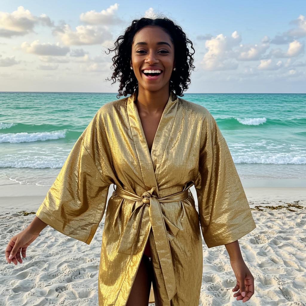 A joyful woman stands on the sunlit Miami beach, her face glowing with happiness. She is elegantly dressed in a shimmering, glossy golden kimono that catches the sunlight beautifully. The intricate details of the fabric reflect a rich texture, highlighting every fold and pattern in high definition. The scene captures the vibrant energy of the beach, with the rhythmic waves gently caressing the shore. The woman's smile and the golden hue of her outfit create a harmonious blend with the natural brightness of the surroundings, embodying a sense of warmth and elegance in this serene coastal setting.