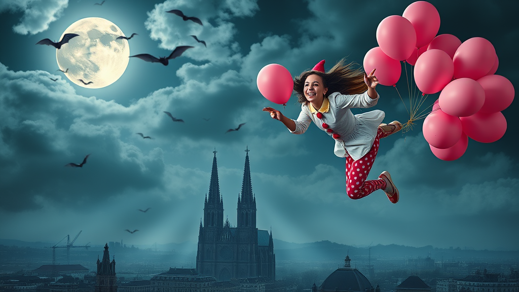 A joyful woman with a kind smile dressed as a flying clown floats gracefully above a bustling cityscape. She clutches a bundle of vibrant pink balloons, her polka-dot leggings adding a playful element to her attire. The scene is set against an ominous midnight sky, with the full moon casting a gentle glow. Flying bats dart through the partially clouded atmosphere, while a majestic cathedral looms in the background, shrouded in volumetric fog. The entire scene is depicted with hyper-realistic detail, reminiscent of an oil painting by Albert Bierstadt, capturing the contrast between the cheerful figure and the eerie beauty of the night.