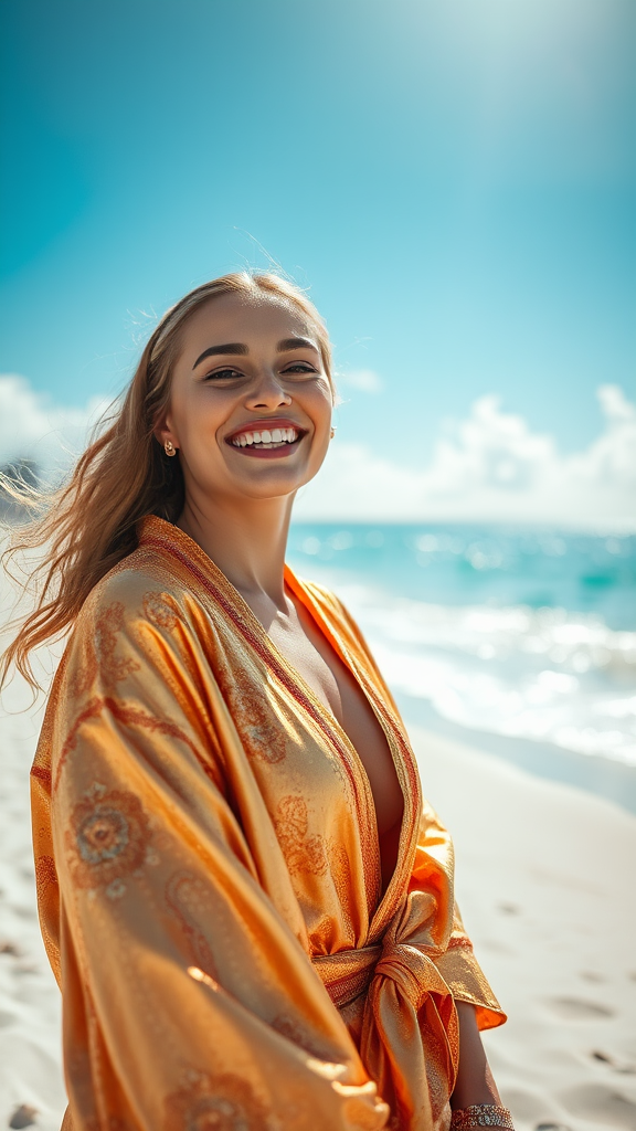 A joyful woman with a radiant smile basks in the Miami sunshine, draped in a shimmering, glossy kimono with a golden hue. The sun's rays reflect off her attire, creating a mesmerizing glow. It's a bright day at the beach, and the sand underfoot contrasts beautifully with the azure sky and gentle waves. The scene captures a sense of serenity and elegance, as the intricate details of her kimono catch the light, showcasing exquisite craftsmanship. Her eyes reflect a sense of joy and tranquility, framed by the vibrant setting. The atmosphere is both lively and peaceful, embodying a moment of blissful harmony.